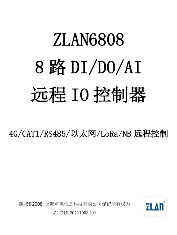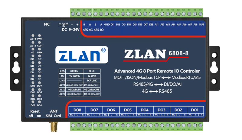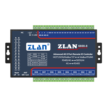 | ZLAN6808-8 | 4G CAT1/GPRS/RS485 | 4G CAT1 | Modbus TCP/Modbus RTU/JSON/ MQTT | 支持4G CAT1通訊或者2G通訊 |